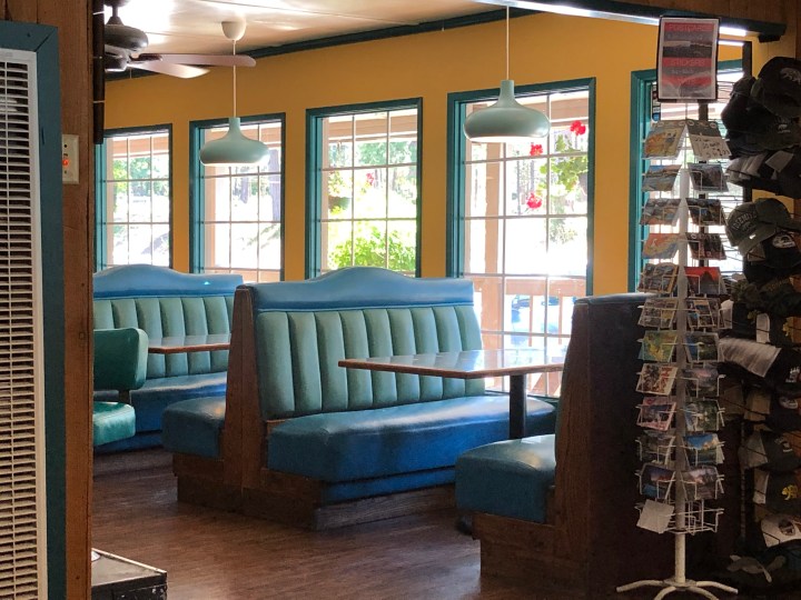 Looks a lot like the truckstops that I encountered in the midWest when we were touring schools’ shows from college. There would be a big truckers side, where they got served first, and a smaller side for the rest of the travelling public, but I don’t remember anything as plush as baby blue booths.