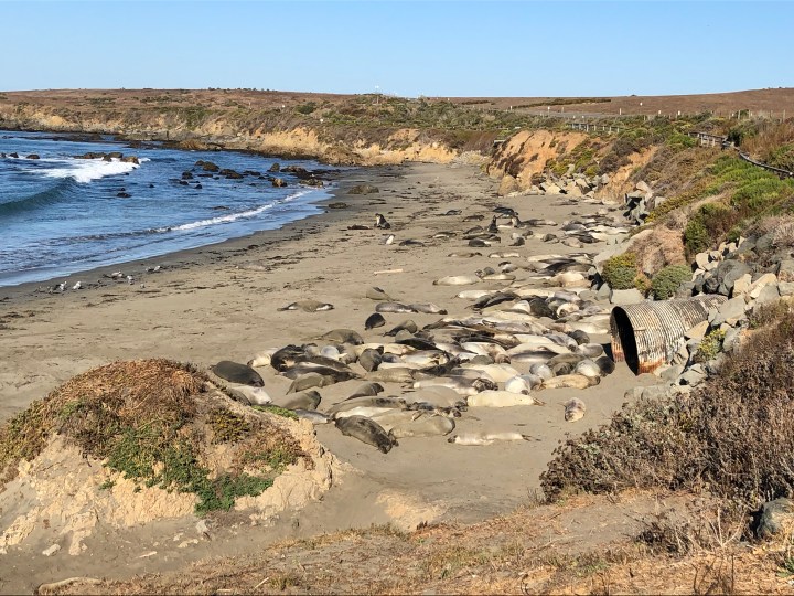 Arriving at San Simeon a bit early, I stopped to drink my coffee and discovered I was at the elephant seal’s favourite beach in California. These are the young ones that don’t have the distinctive noses yet. Their parents are in Alaska, eating – according to a volunteer.