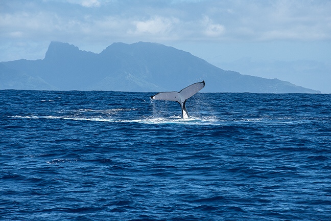 However, we saw several humpback whales including two mothers with calves and one of them obligingly breached in front of us. Not to mention the one posing with its tail out of the water in front of Moorea as if it had heard David Attenborough was doing a calendar.