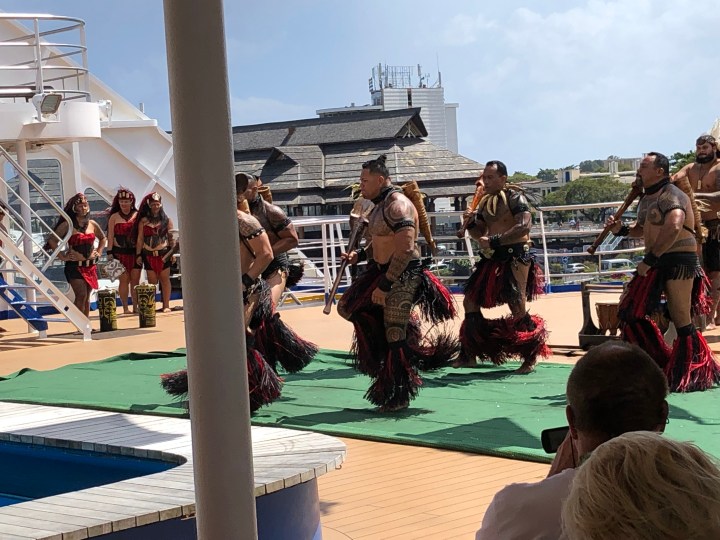 So we got here early today. We have had a welcoming dance from a lot of muscular young men with tattoos, lifeboat drill and a 3 course lunch (more purple mash) and are heading off from Tahiti in a northerly direction (possibly). Now the Wi-fi is efficient but v expensive so I have to make this short and sweet. There is a dance class this afternoon followed by happy hour in at least 2 bars.