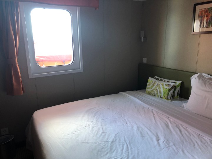 My cabin (see picture below) has a window which is not as advertised although, as there is a lifeboat blocking most of it, it could be described as ‘restricted view’.