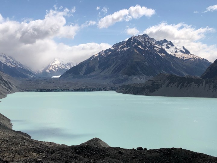 Today we were travelling to Christchurch via the Mount Cook National Park. Absolutely beautiful. We climbed up some terminal moraine (see, the O level geography came in useful finally) to look at the Tasman glacier before it disappears from sight. Depressing signs about where it was in 1990 and before that. On the way down, my knee gave way which is a bit worrying when falling over means bouncing down about 100ft of rocks. Luckily the lovely Heu walked down between me and the edge to ensure that, if it happened again, I fell on him, not on the rocks.