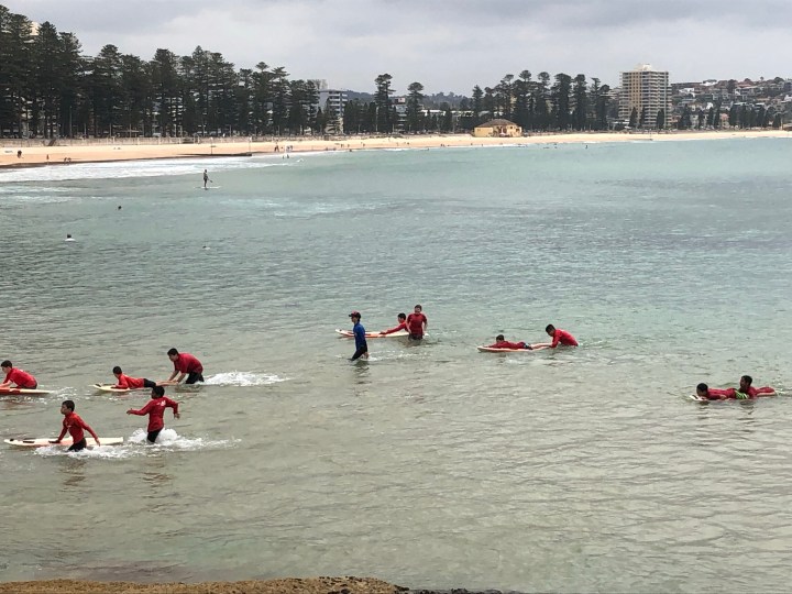 There have been lots of groups of kids on various beaches doing swimming, running and other outdoor-type things. This lot are doing surf lifesaving.