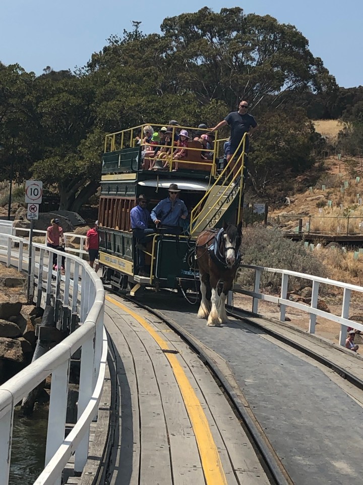 Victor Harbor is a holiday resort with a nice beach and a horse tram! Originally built to load wool coming down the Murray River onto clippers to go to England, it now works entirely for tourists. It’s on rails so the horse doesn’t have to work as hard as you’d think.