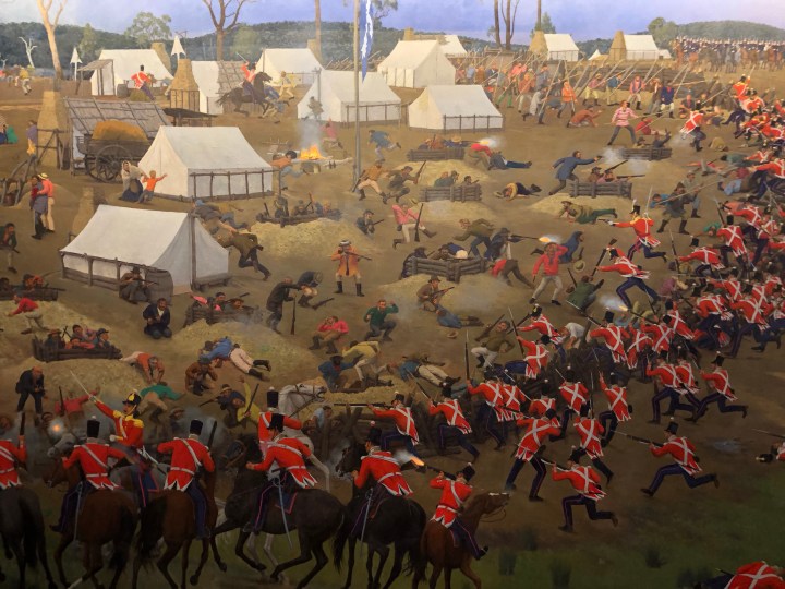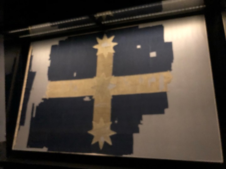 Still in Ballarat. Had to have a massage this morning because of completely knotted shoulder and migraine. After that we went to the Eureka museum. The Eureka Stockade is considered to be the first victory for working men’s rights. See https://en.m.wikipedia.org/wiki/Eureka_Rebellion for further details. This is their flag – the first Australian flag.