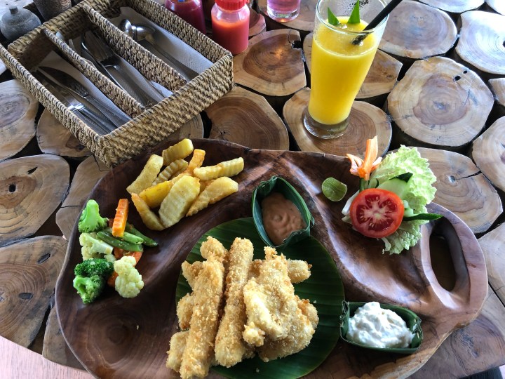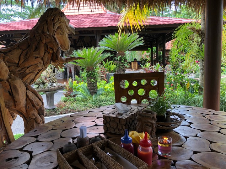 Then there was more photogenic lunch – not cooked by me. Not sure why there is a tyrannosaurus in the middle of the restaurant.