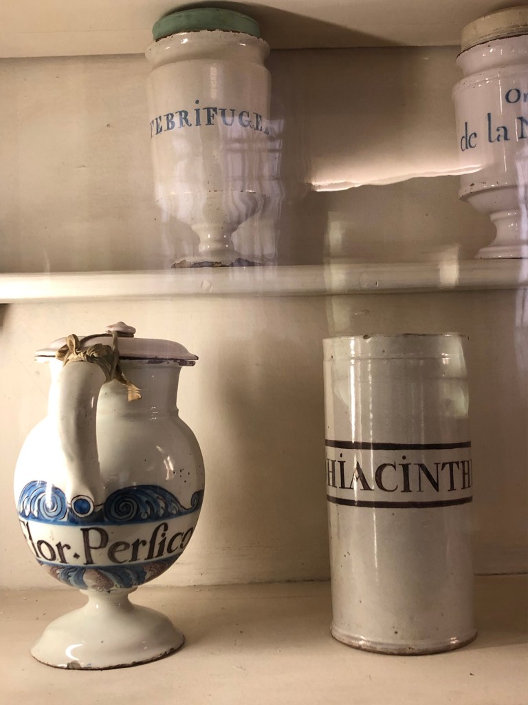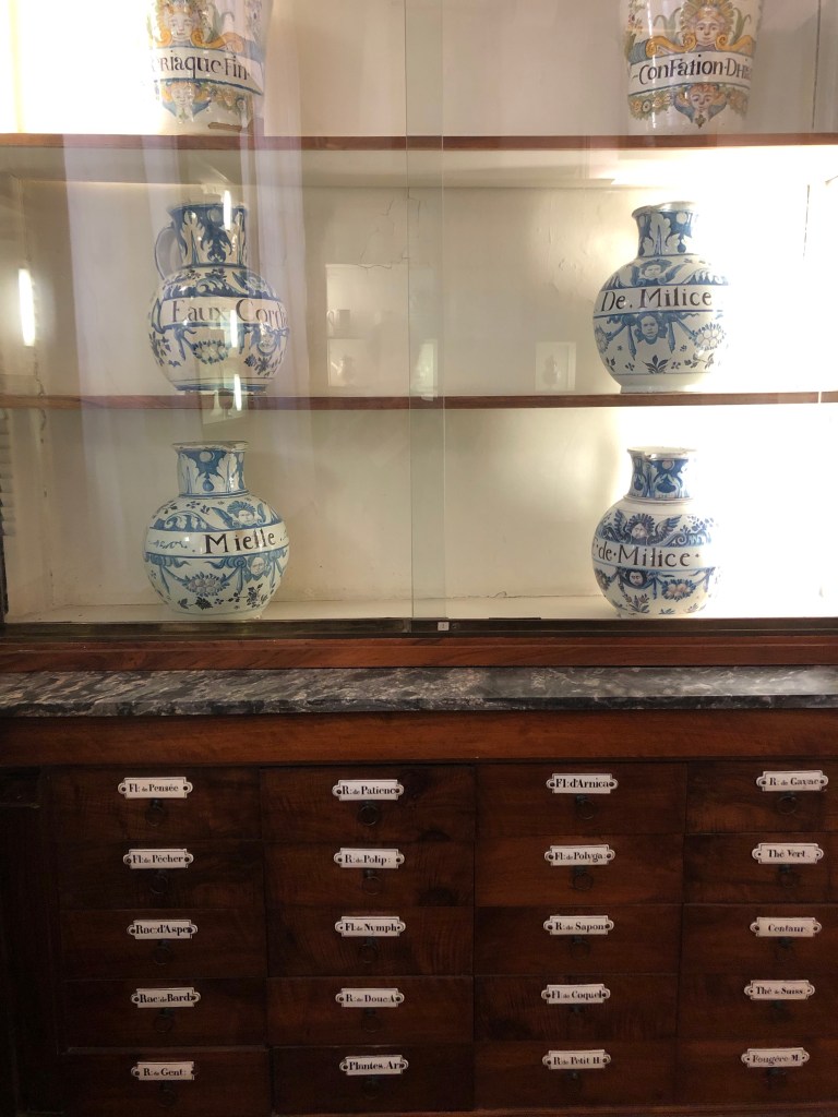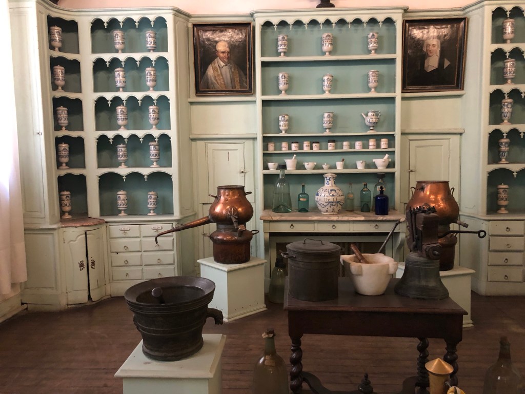 The pharmacy is in two rooms and remains as it was when it closed in 1965. The 18thC room contains a wide range of pots and bottles of the period. This was the only pharmacy for the poor during the 18thC Plague epidemic and was connected with the charitable hospital. The other room opened in 1834. The pictures are of the various benefactors.