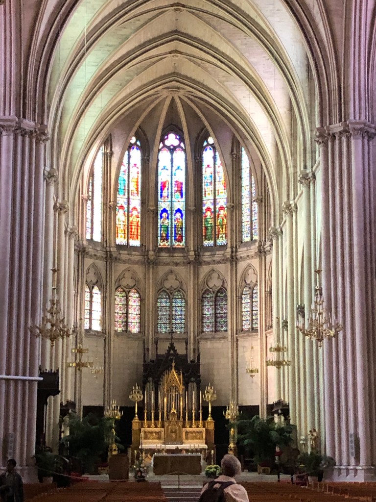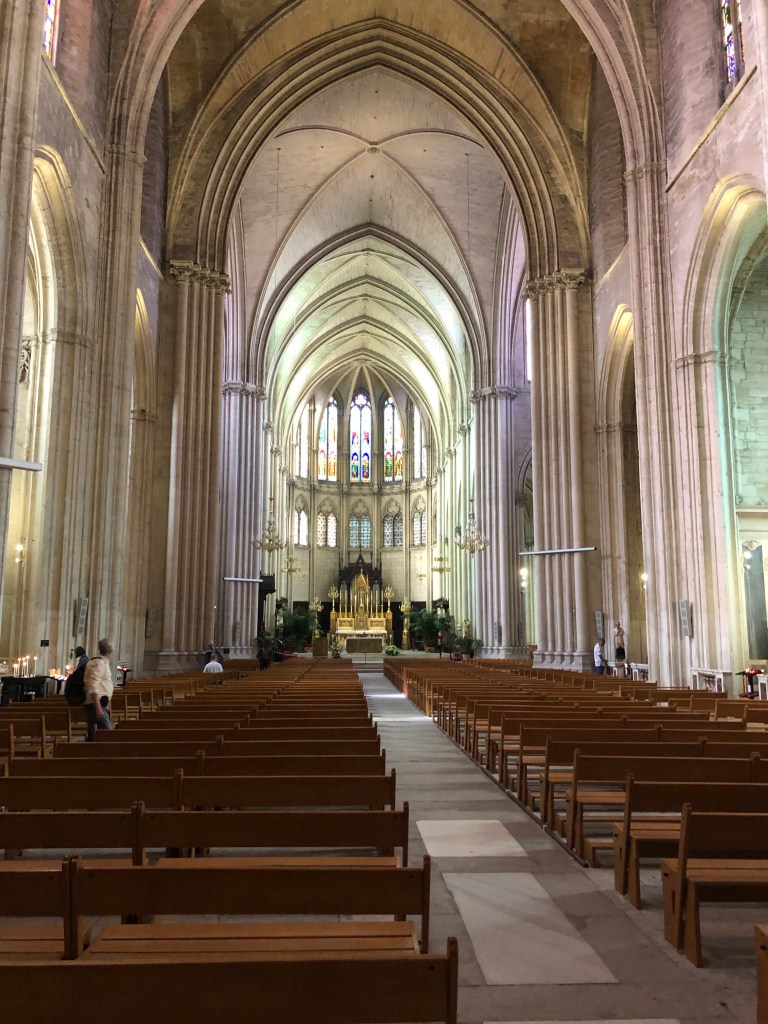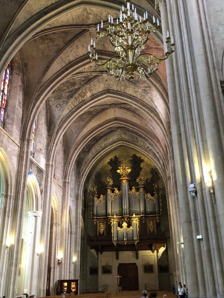 Following wandering, coffee and buns in a tree shaded cafe, we went to the cathedral. This is very austere, in a mid Victorian counter- reformation style and looks as if it could do with some repairs to the roof. Apparently it was originally built in the 14thC as a monastery church and became the cathedral in the 16thC when the bishop moved there. It was also fortified and Protestant / Catholic battles fought over it in the 16thC Wars of Religion. Heavily rebuilt in the 19thC.