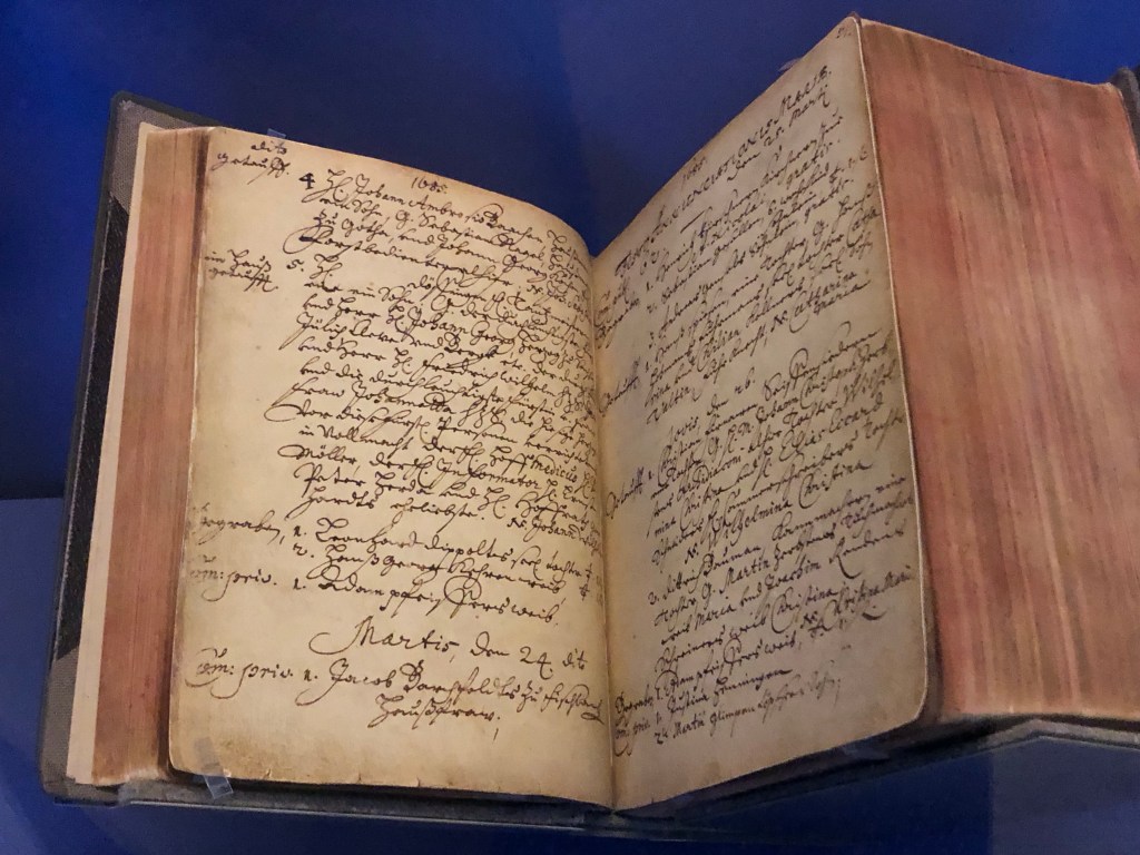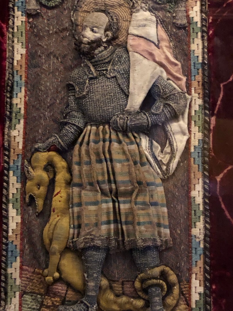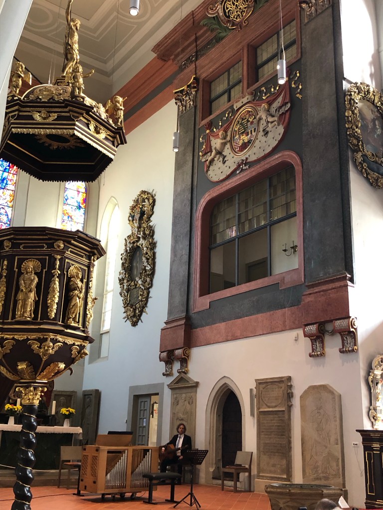 Martin Luther house and museum. Much restored, they thought there was actually nothing left of the house he inhabited until they did some dating on the timbers and found one cut down in the 13C. St George. In a kilt! With a very dead looking dragon. This is from a priest’s cope that was remade into an altar frontal after the Reformation. Bach’s baptism record on display in the Martin Luther museum. the Bach museum, down the street, only has a facsimile. Outside the Bach museum they have thought of everything. Dog parking zone. At the Bach museum they have a collection of old instruments. This young man (philosophy student) was explaining and playing them. St George’s church. We had a concert here with Vox Luminis. St George’s Church. No indication as to who the enormous pew was built for but presumably the local Lord. The GDR wasn’t keen on that sort of thing.