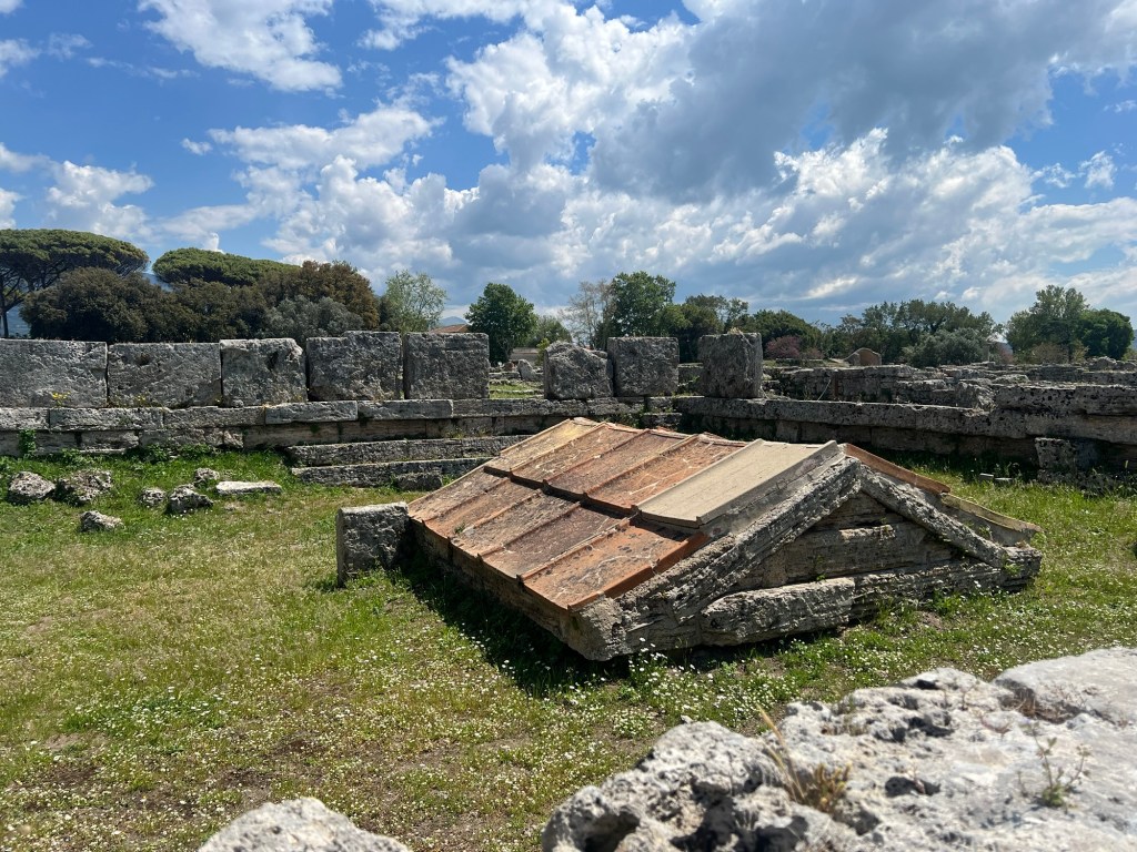 Paestum was a Greek colony dedicated to Poseidon and changed its name under the Romans. It was abandoned in the 9C when the river dried up and moved course. The sea is also now 2km away rather than right outside.