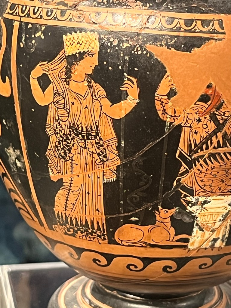 Handmaiden with whippet! This vase and others nearby with female figures on them were apparently for weddings.
