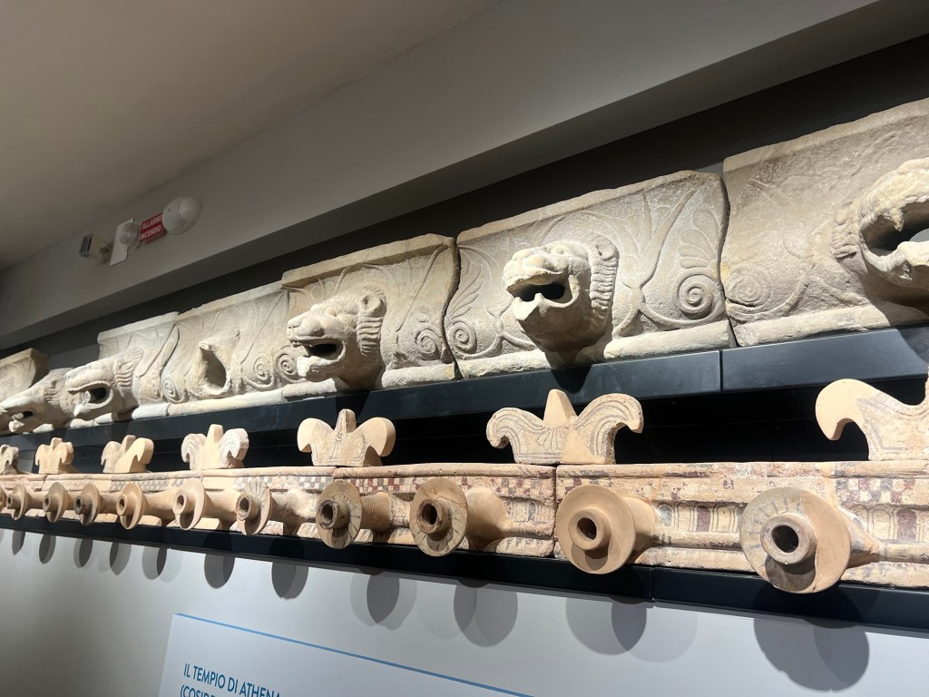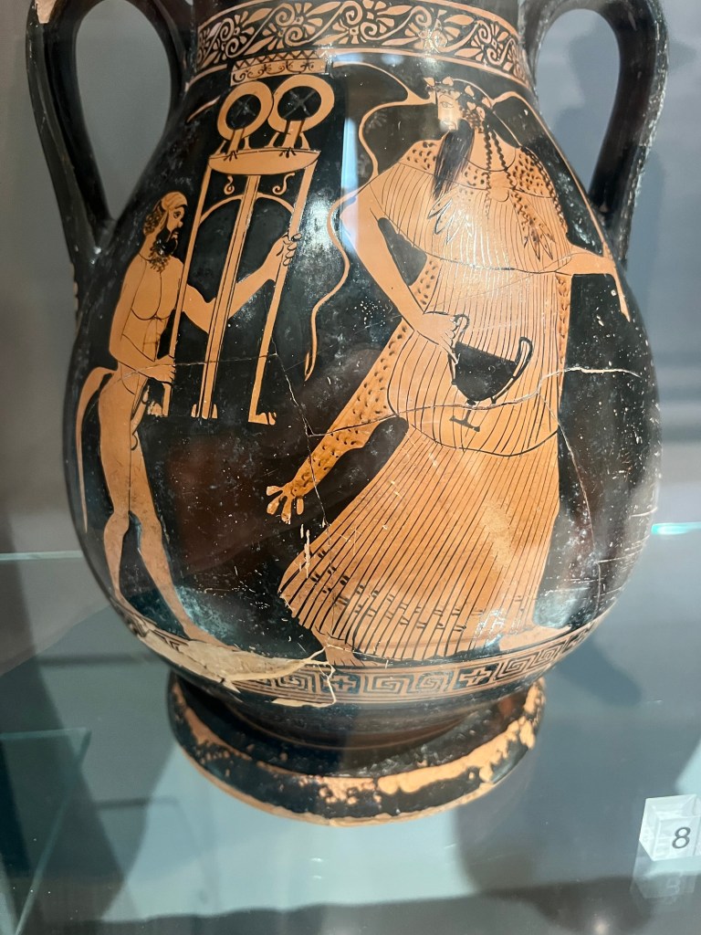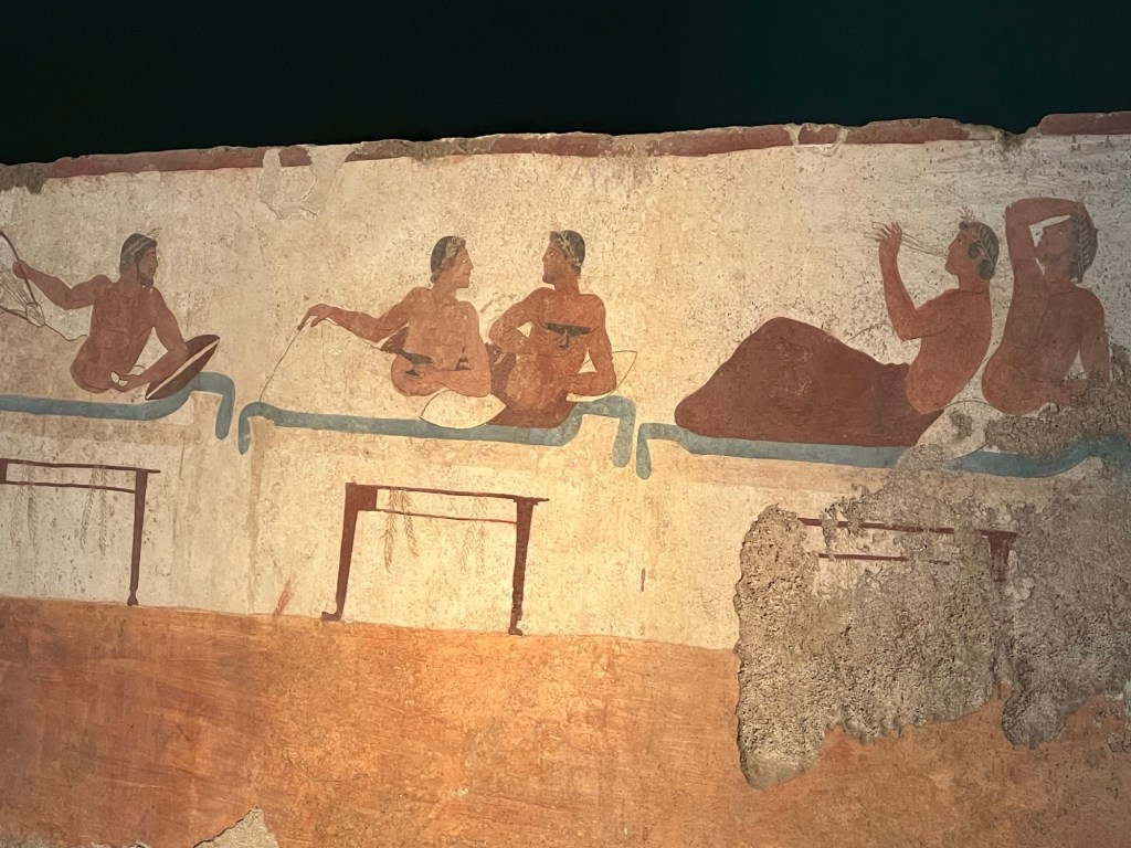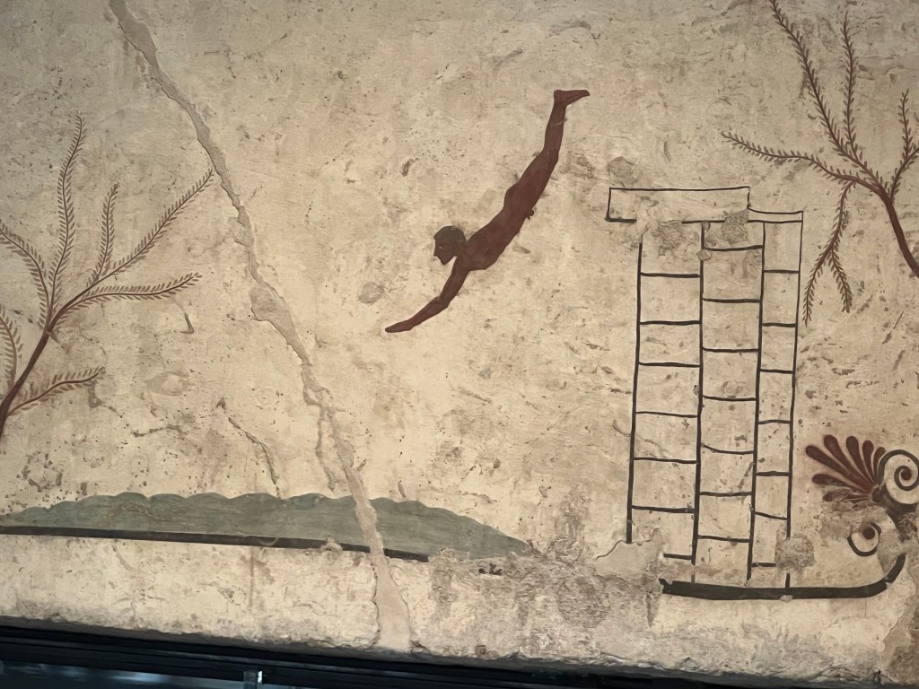 This is the most famous thing in the museum. The grave of the diver. It is the interior of a cist grave of a young man, found in one of the city graveyards. No one seems to know what the symbolism of the diver means – if anything.