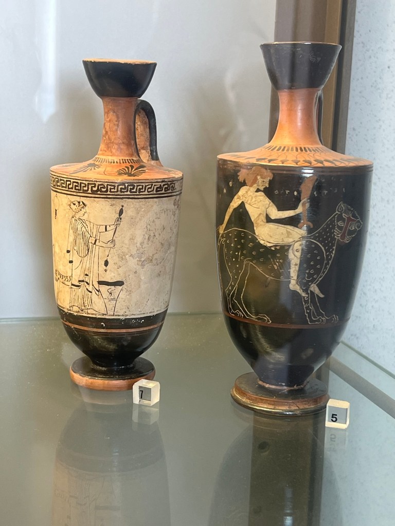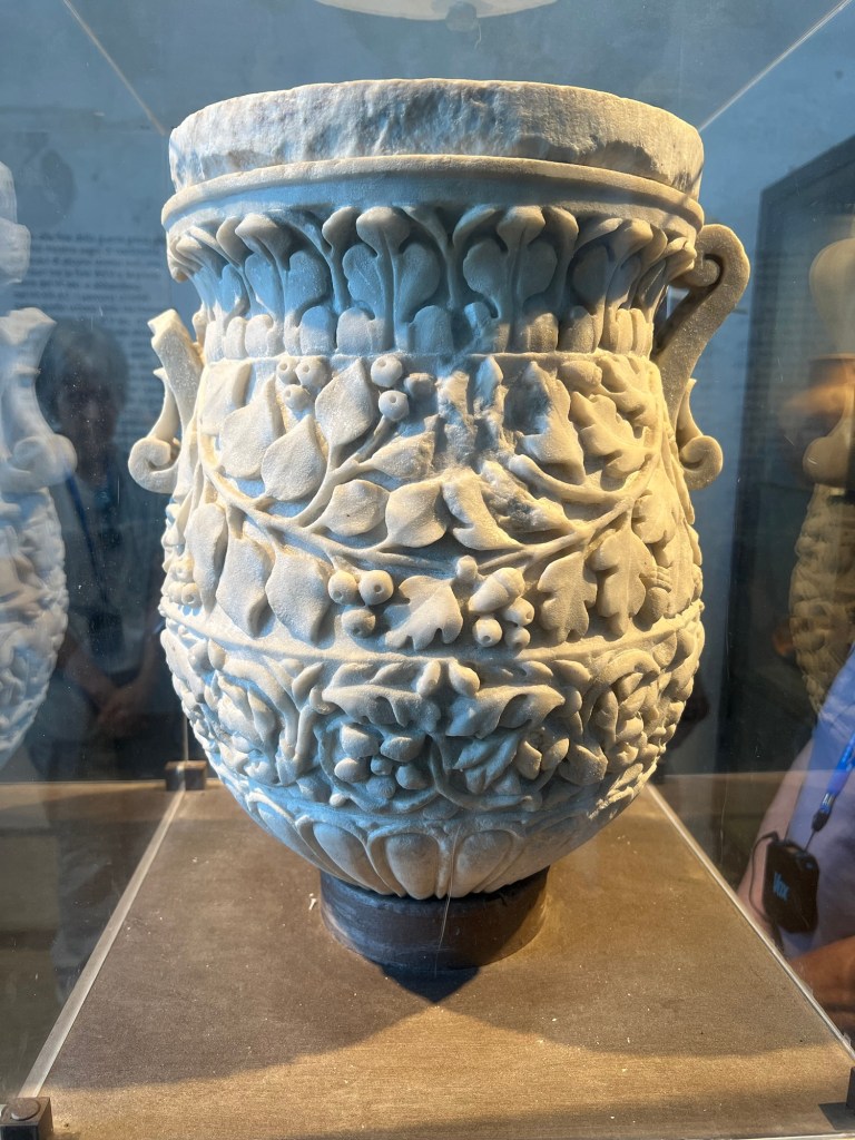 1. Wow! Lots to write and think about…the coin with the arena scene on it, could it show a lion fighting people riding ostriches? The dark jug with the sea-horse on it could have come from any posh contemporary ceramics studio. The Iron Age pot is more decorated than anything of the period I’ve ever seen! and the marble statue…despite the missing bits, you know that you’ve got a top knotch sculptor when he/she can create apparently solid flesh under a filmly dress. What fun and I think you’re right about the smog…definitely a better time to visit than high Summer.