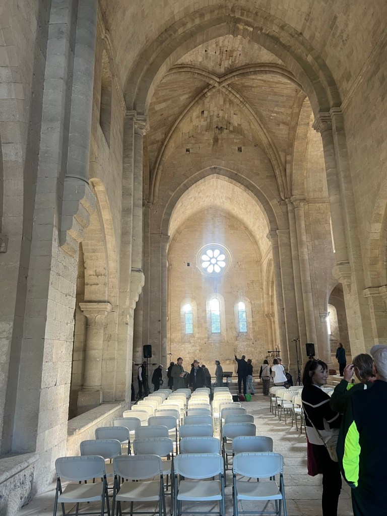 Having finished the buffet (and the following ‘soiree cabaret’) at 11pm, we were up and about to go out to Silvacane Abbey at 9am. We were taken in cars by our hosts. I was chauffeured with another couple by lovely people in a brand new enormous Range Rover (which, when we had to take a diversion to avoid an accident, could be lowered at the press of a button to get under a very low bridge). During a discussion of how expensive it was to live in Aix, they revealed their ownership of a ski chalet in the Val d’Isere. Nice work if you can get it.